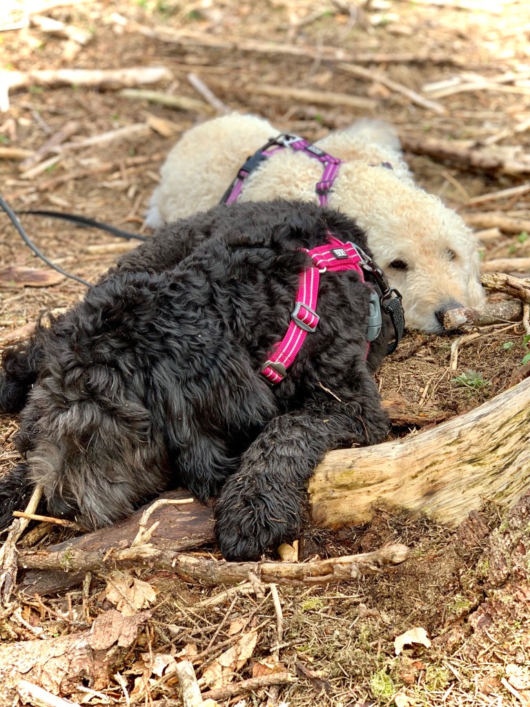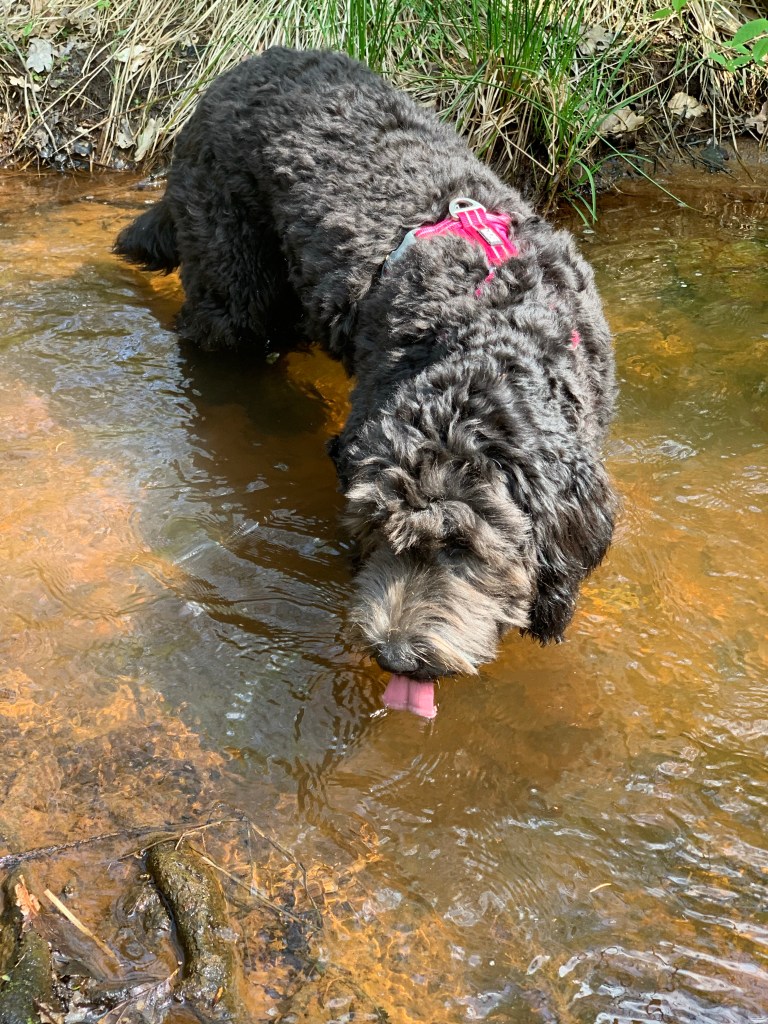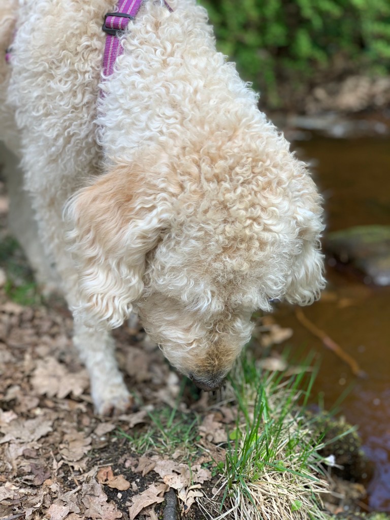 Härligt att få svalka tassar och dricka vatten efter en promenad🌿🐾Med ett helt gäng i Osbecksskogens grönska🌿Mums, gräs!! men mår oftast illa efter detta intag😳Gos med Jonas🌿Lille Vicke med Lucky boy🐾🌿Vilka dofter🥰Gott med kallt vatten🌿🐾Nu fikar människorna. Då passar vi på att pausa🌿🐾