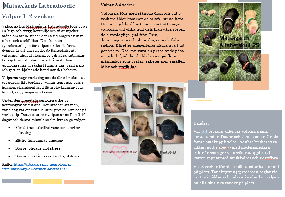 Nu när Alfabetskullen är inne på sin femte levnadsvecka tänkte jag berätta hur vi på Matsagårds LD har arbetat med valpkullen. Det kan ju vara så att valparna blir fina och trevliga utan att lägga ner mycket arbete men vi vill inte chansa utan vi satsar mycket på att socialisera valpkullarna under uppfödarens viktiga 8 veckor. Vi vill ge valparna de bästa förutsättningarna att växa och förbereda dem inför att utvecklas till ”hund”.