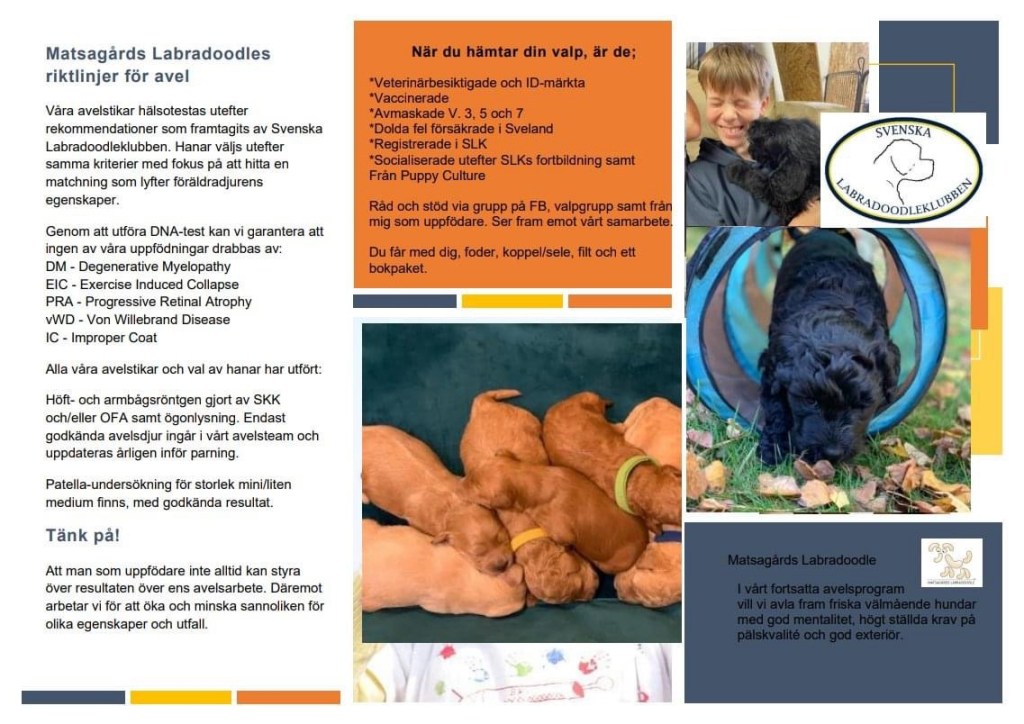 I vårt avelsarbete följer vi Svenska Labradoodleklubbens riktlinjer för avel och ställer oss bakom klubbens syn på avelsbegränsning. Läs gärna mer om Labradoodle, rasstandard och klubbens avelskriterier på http://www.labradoodleklubben.se