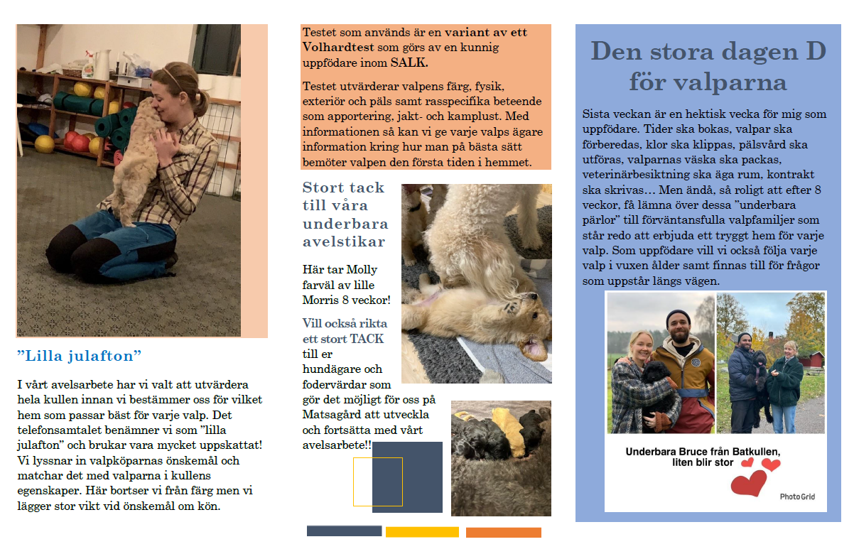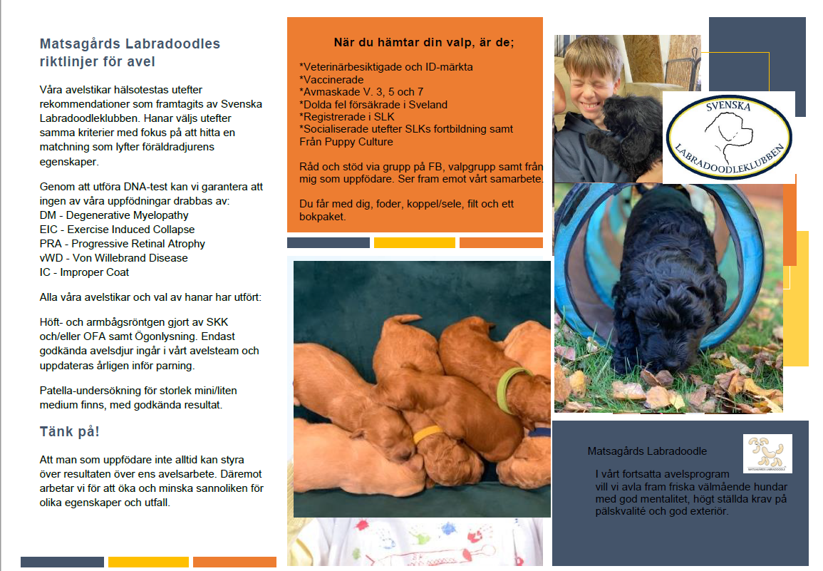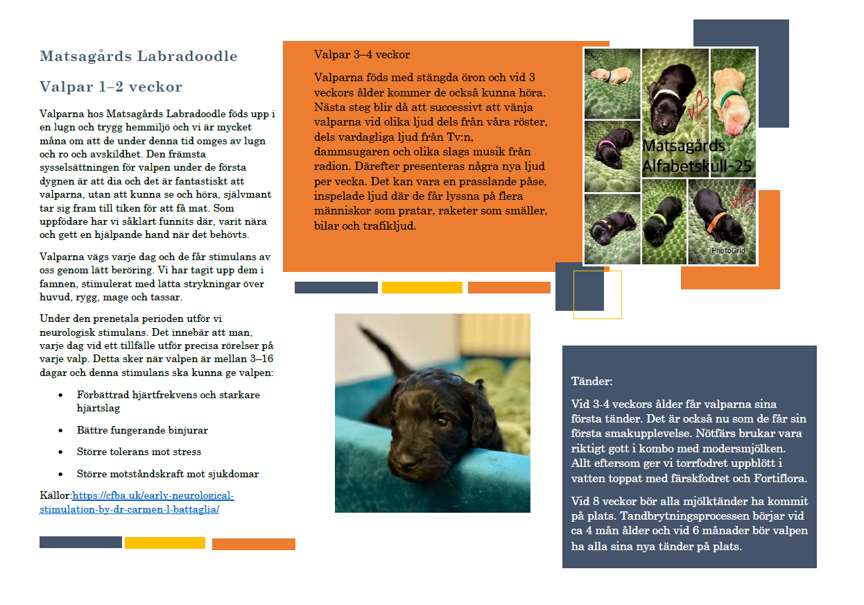 Från det att valpkullen föds påbörjas ett gediget arbete för oss som uppfödare. Under 8 veckor vill vi därför ge valparna en god start. Allt eftersom valparna växer så höjer vi också ribban med att socialisera valparna. Vårt motto är att ge valparna de bästa förutsättningarna att växa och förbereda dem inför att utvecklas till ”hund”.